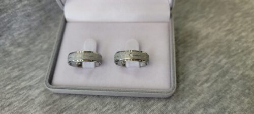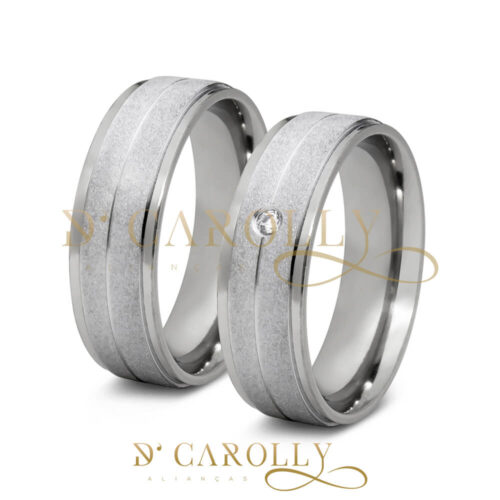 Acabamento externo: Másc: Reta, com parte central diamantada, com friso central. Rebaixo com acabamento polido nas laterais. | Fem: Reta, com parte central diamantada, com friso central e pedra de zircônia cravada. Rebaixo com acabamento polido nas laterais
