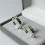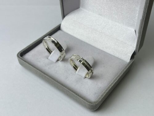 Descrição: Aliança de compromisso ou namoro, exclusiva, produzida em prata. A aliança masculina tem acabamento reto, polido, com friso no canto. Na feminina ao invés do friso, temos pedras de zircônia cravadas no trilho. Excelente durabilidade. A prata é um metal nobre! Demanda alguns cuidados relacionados ao uso, como característica do material, tende a oxidar quando exposto a alguns produtos químicos e índices elevados de ácido úrico.