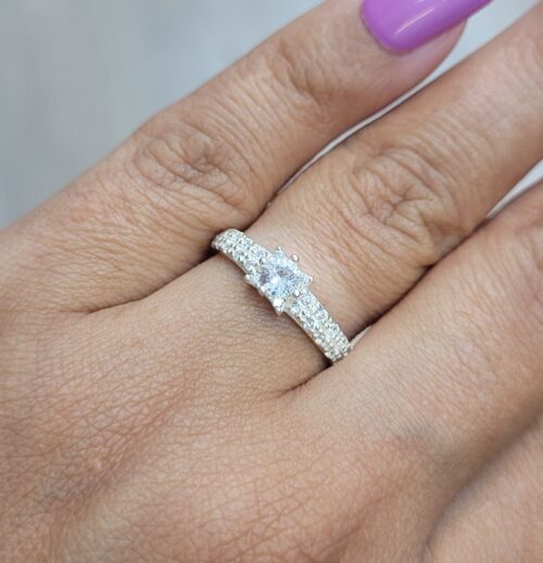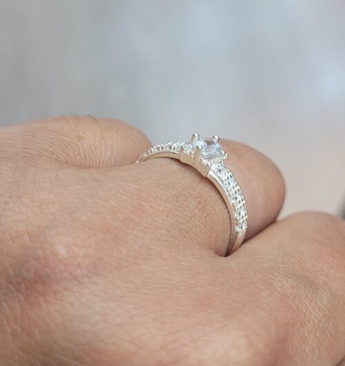 Anel Solitário de Prata, cravejado com pedras de zircônia, caixa da pedra grande com detalhe de estrela.