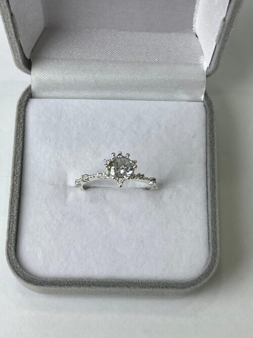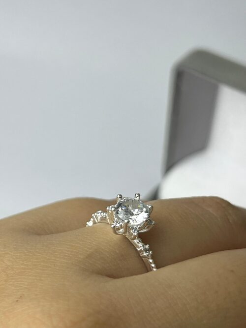 Descrição: Solitário em Prata com 1 pedra grande em destaque, 6 pedra pequenas na volta da principal e mais 3 pedras pequenas em cada lateral acompanhadas de detalhes.
