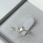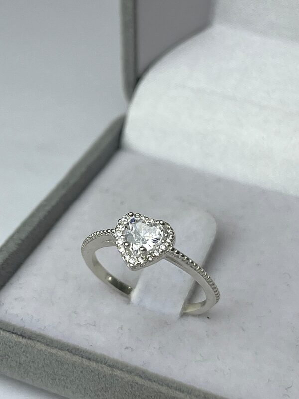 Descrição: Solitário em Prata com 1 pedra grande em destaque no formato de coração, e 16 pedras pequenas na volta da principal, acompanhadas de detalhes.