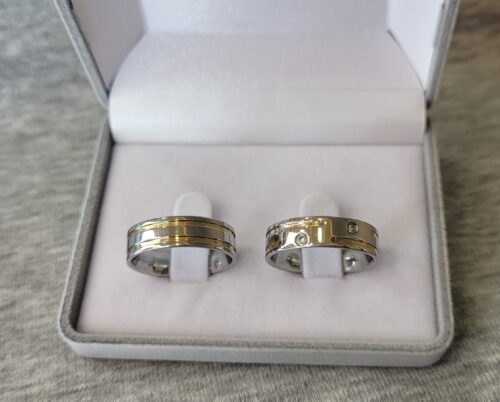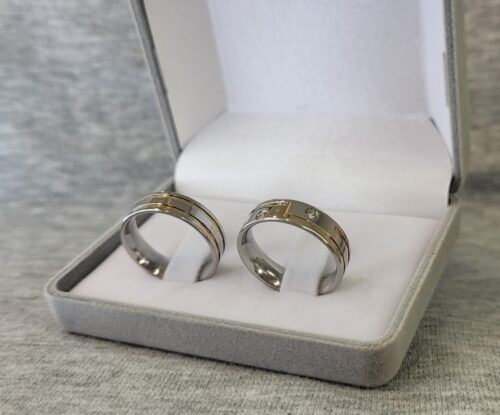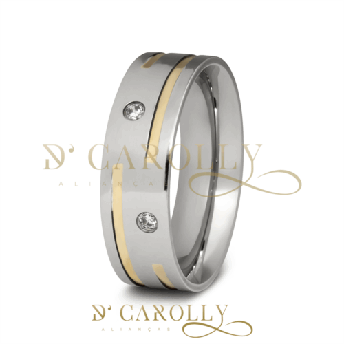 Descrição:Aliança de compromisso ou namoro, discreta, produzida em aço inox com cravação de 2 pedras de zircônia, frisos e filetes de ouro. Excelente durabilidade. Este material não oxida com o tempo como a prata, não demanda manutenção e é altamente resistente a riscos.