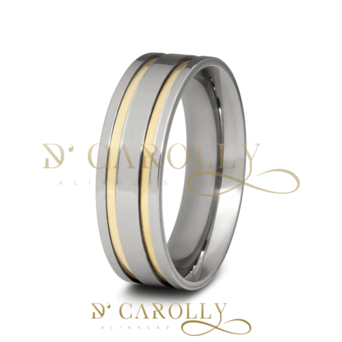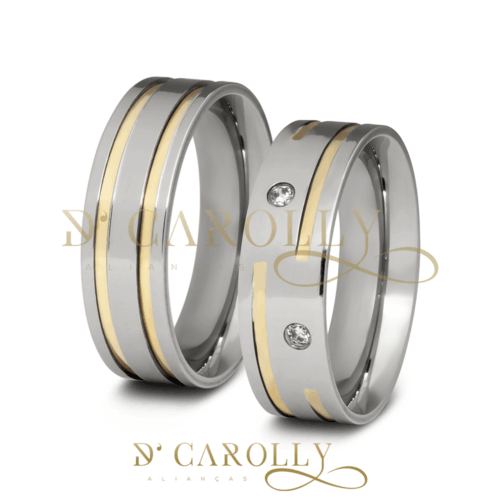 Acabamento externo: Másc: Reta, polida, com 2 friso e filetes de ouro | Fem: Reta, polida, com 2 frisos , filetes de ouro e 2 pedras de zircônia cravada