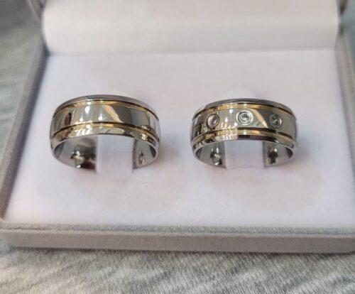 Descrição:Aliança de compromisso ou namoro, produzida em aço inox com cravação de 3 pedras de zircônia, frisos laterais e filete de ouro. Excelente durabilidade. Este material não oxida com o tempo como a prata, não demanda manutenção e é altamente resistente a riscos.