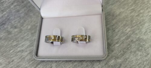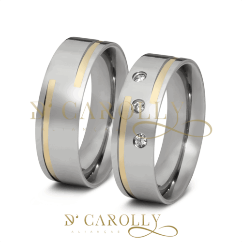 Acabamento externo: Másc: Reta, polida, com friso tipo rosca e filete de ouro | Fem: Reta, polida, com friso tipo rosca, filete de ouro e 3 pedra de zircônia cravadas