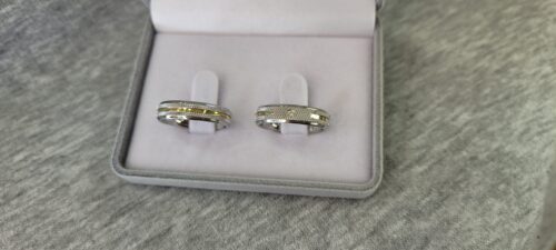 Acabamento externo: Másc.: Abaulada, recartilhada, friso central com filete de ouro. | Fem.: Abaulada, recartilhada, friso central com filete de ouro e pedra de zircônia cravada.