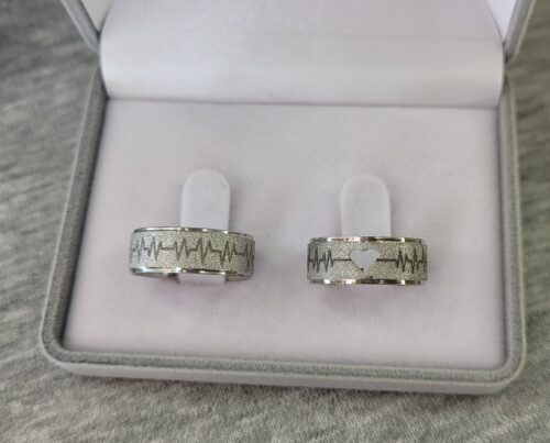 Acabamento externo: Másc: Reta, diamantada com batimentos cardíacos gravado a laser e rebaixo polido nas laterais.| Fem: Reta, diamantada, com batimentos cardíacos gravado a laser, coração vazado e rebaixo polido nas laterais.