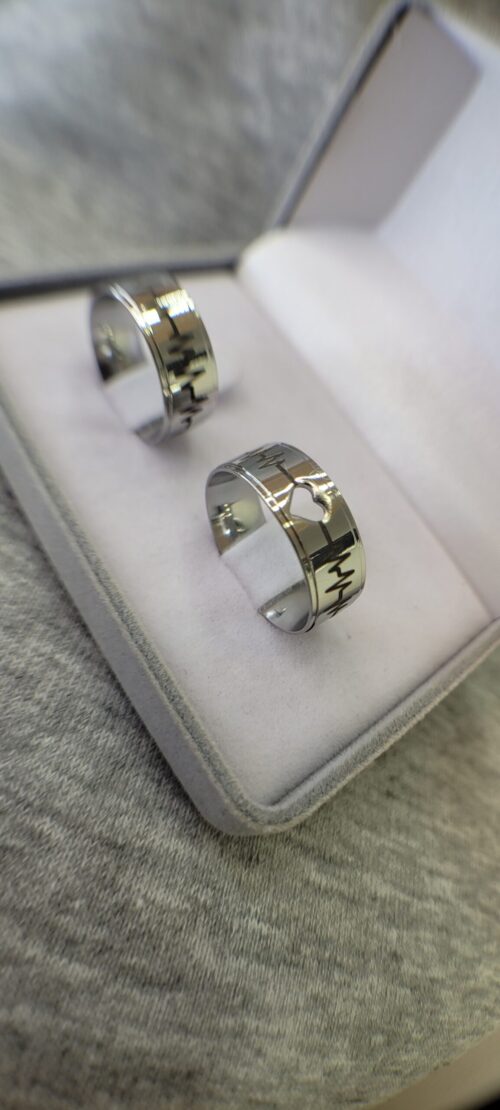 Acabamento externo: Másc: Reta, polida com batimentos cardíacos gravado a laser e rebaixo polido nas laterais.| Fem: Reta, polida , com batimentos cardíacos gravado a laser, coração vazado e rebaixo polido nas laterais.
