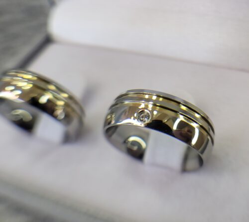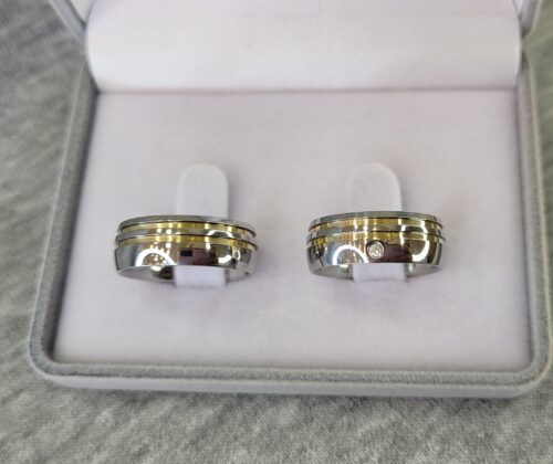 Descrição:Aliança de compromisso ou namoro, discreta, produzida em aço inox com cravação de pedra de zircônia, frisos laterais e filetes de ouro. Excelente durabilidade. Este material não oxida com o tempo como a prata, não demanda manutenção e é altamente resistente a riscos.