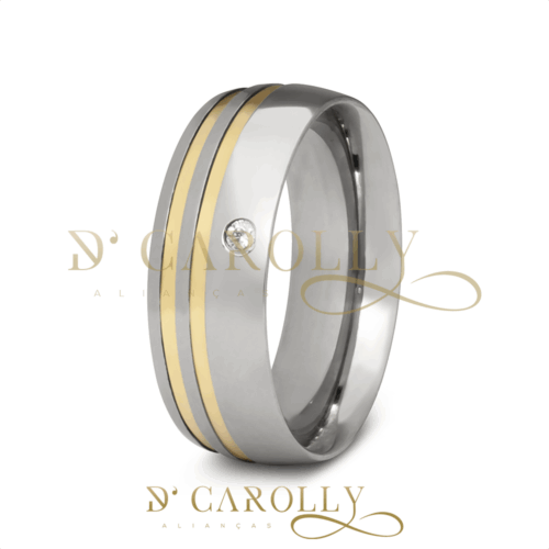 Aliança de aço inox abaulada com pedra | 2 Frisos | 2 Filetes de ouro | 7 mm