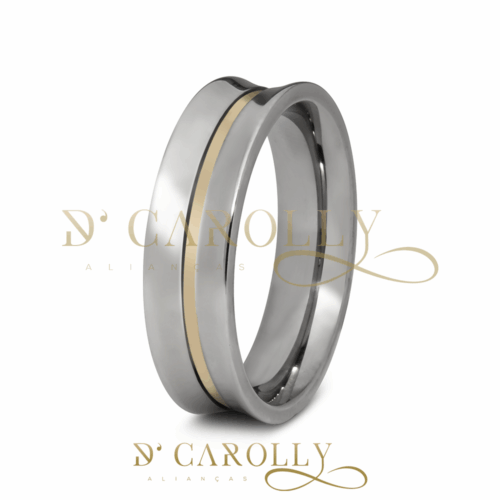 Acabamento externo: Másc.: Côncava, polida, com friso e filete de ouro. | Fem.: Côncava, polida, friso com filete de ouro e pedra de zircônia cravada.