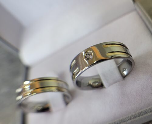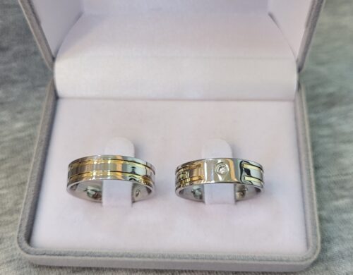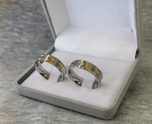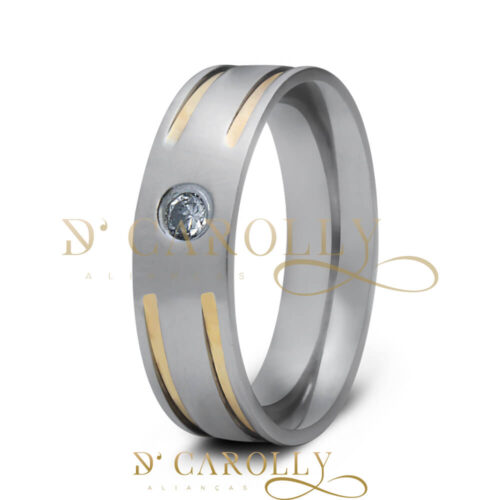 Descrição:Aliança de compromisso ou namoro, discreta, produzida em aço inox com cravação de pedra de zircônia, frisos e filetes de ouro. Excelente durabilidade. Este material não oxida com o tempo como a prata, não demanda manutenção e é altamente resistente a riscos.