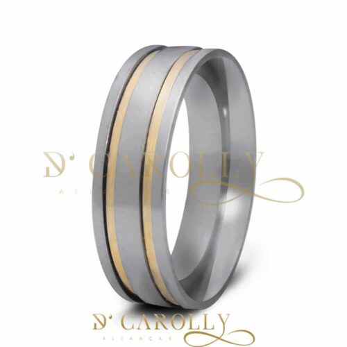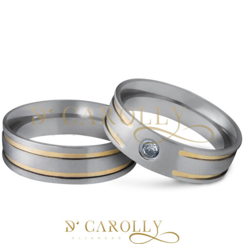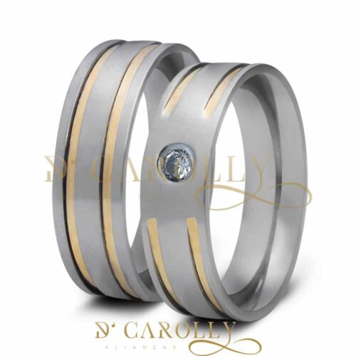 Acabamento externo: Másc: Reta, polida, com 2 friso e filetes de ouro | Fem: Reta, polida, com 2 frisos , filetes de ouro e pedra de zircônia cravada