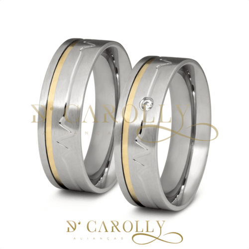 Acabamento externo: Másc: Reta, fosca, com batimentos cardíacos, friso na lateral com filete de ouro | Fem: Reta, fosca, com batimentos cardíacos, friso na lateral com filete de ouro e pedra de zircônia cravada