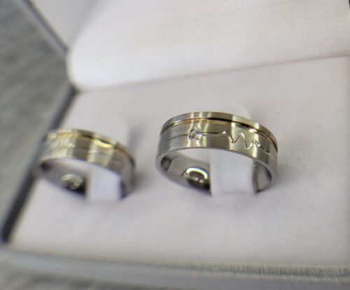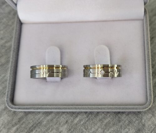 Descrição:Aliança de compromisso ou namoro, discreta, produzida em aço inox com cravação de pedra de zircônia, com batimentos cardíacos, friso na lateral com filete de ouro. Excelente durabilidade. Este material não oxida com o tempo como a prata, não demanda manutenção e é altamente resistente a riscos.