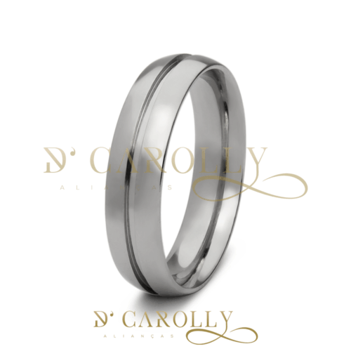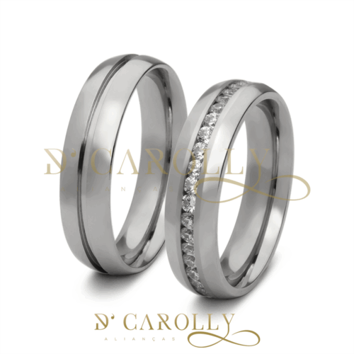 Acabamento externo: Másc.: Abaulada, polida, com friso no centro. | Fem.: Abaulada, polida, trilho de pedras de zircônias cravadas no centro.
