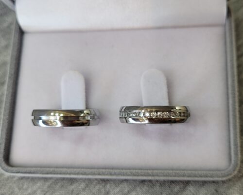 Descrição:Aliança de compromisso ou namoro, exclusiva, produzida em aço inox. A aliança masculina tem acabamento abaulado, polido, com friso no centro. Na feminina ao invés do friso, temos pedras de zircônia cravadas no trilho. Excelente durabilidade. Este material não oxida com o tempo como a prata, não demanda manutenção e é altamente resistente a riscos.