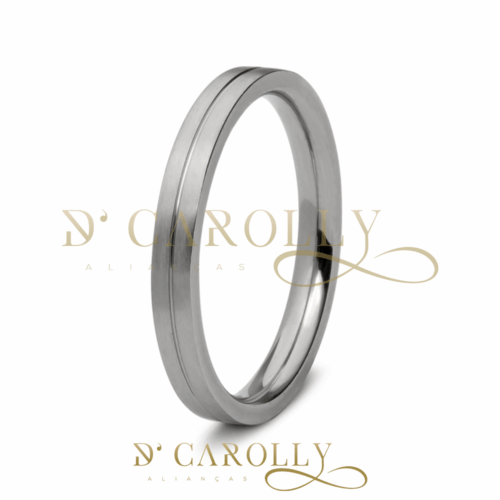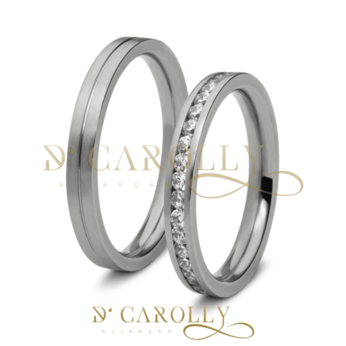 Acabamento externo: Másc.: Reta, fosca, com friso no centro. | Fem.: Reta, polida, trilho de pedras de zircônias cravadas no centro.