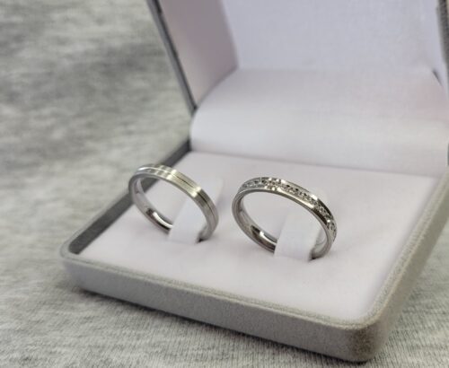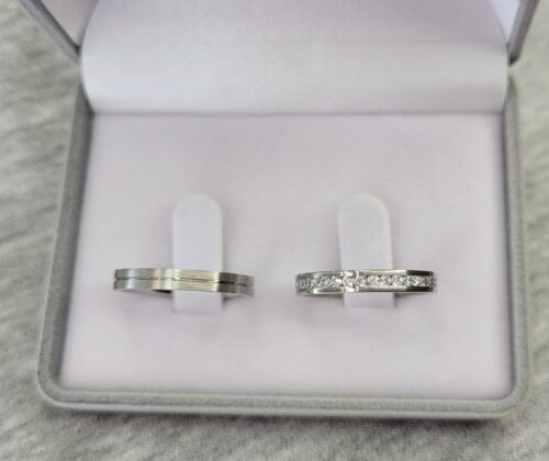 Descrição:Aliança de compromisso ou namoro, exclusiva, produzida em aço inox. A aliança masculina tem acabamento reto, polido, com friso no centro. Na feminina ao invés do friso, temos pedras de zircônia cravadas no trilho. Excelente durabilidade. Este material não oxida com o tempo como a prata, não demanda manutenção e é altamente resistente a riscos.