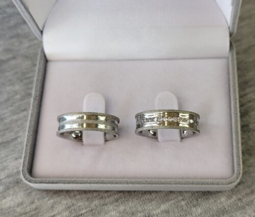 Descrição:Aliança de compromisso ou namoro, exclusiva, produzida em aço inox. A aliança masculina tem acabamento reto, polido, diamantada nas bordas em relevo e no friso central. Na feminina, se mantém as bordas diamantadas e substitui-se o friso por um trilho com pedras de zircônia cravadas no centro. Excelente durabilidade. Este material não oxida com o tempo como a prata, não demanda manutenção e é altamente resistente a riscos.
