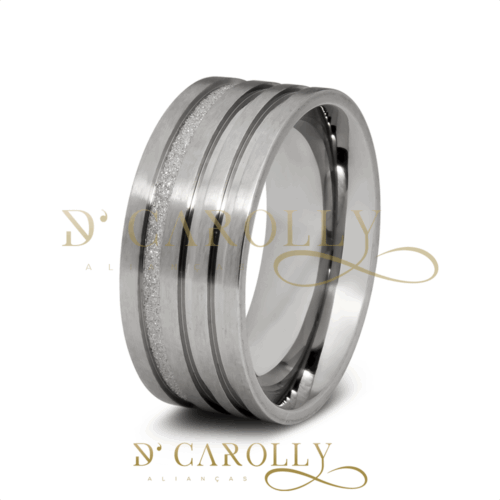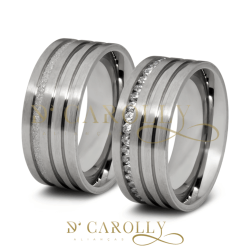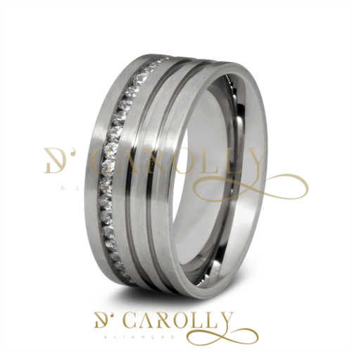 Acabamento externo: Másc.: Reta, polida, 2 frisos e um canal com efeito diamantado. | Fem.: Reta, polida, 2 frisos e pedras de zircônia cravadas no trilho