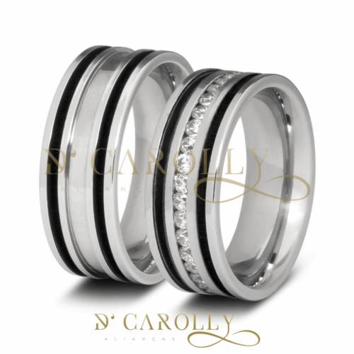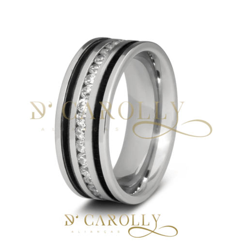 Descrição:Aliança de compromisso ou namoro, exclusiva, produzida em aço inox com 2 friso pretos (canal black) nas laterais e trilho central com pedras de zircônia cravadas. Excelente durabilidade. Este material não oxida com o tempo como a prata, não demanda manutenção e é altamente resistente a riscos.