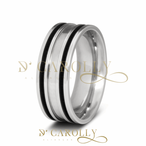 Acabamento externo: Másc: Reta, polida, com 2 friso pretos (canal black) nas laterais e rebaixo no centro. / Fem: Reta, polida, com 2 friso pretos (canal black) nas laterais e trilho central com pedras de zircônia cravadas.