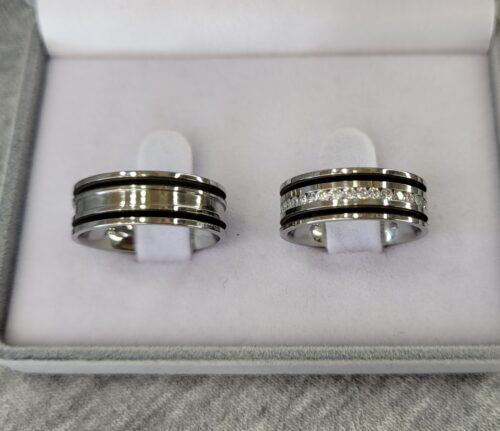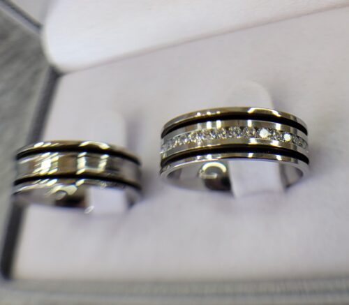 Descrição:Aliança de compromisso ou namoro, exclusiva, produzida em aço inox com 2 frisos pretos (canal black) nas laterais e trilho central com pedras de zircônia cravadas. Excelente durabilidade. Este material não oxida com o tempo como a prata, não demanda manutenção e é altamente resistente a riscos.