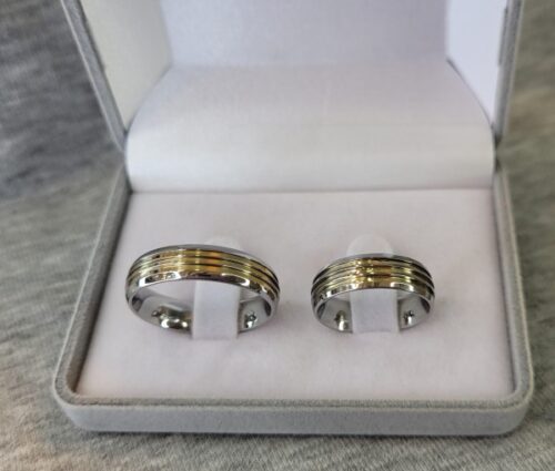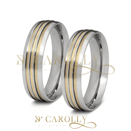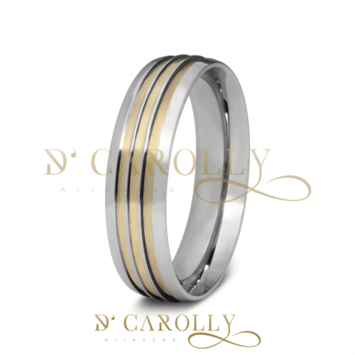 Descrição:Aliança de compromisso ou namoro, unissex, produzida em aço inox com 3 frisos e 3 filetes de ouro. Excelente durabilidade. Este material não oxida com o tempo como a prata, não demanda manutenção e é altamente resistente a riscos.