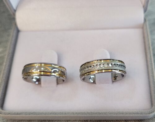 408 / 408-1 : Aliança de aço inox abaulada com pedras | Frisos | Filetes de ouro | Diamantada | 6 mm | Par