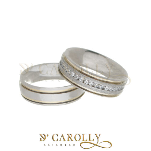 Acabamento externo: Másc.: Abaulada, polida, 2 frisos nas laterais, com filetes de ouro. | Fem.: Abaulada, polida, friso com filete de ouro, Meio Diamantado, e trilho de pedras de zircônia cravadas no centro.