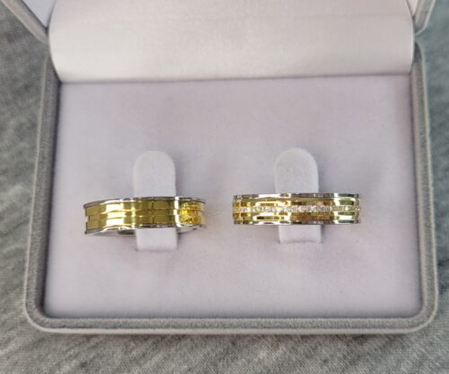 Acabamento externo: Másc.: Reta, polida, com aro central folheado a ouro | Fem.: Reta, polida, com aro central folheado a ouro e trilho com pedras de zircônia cravadas.