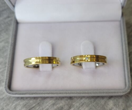 Acabamento externo: Másc: Reta, polida, com friso central | Fem: Reta, polida, com friso central, e pedra de zircônia cravada