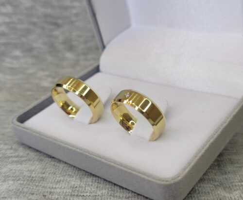 Descrição: Aliança tradicional de casamento ou noivado com 5 mm de largura, chanfrada nas laterais, produzida liga de moeda antiga com pedra de zircônia cravada, anatômica. Este material demanda alguns cuidados, esta liga tende a oxidar com o tempo, a limpeza e manutenção diária do material fazem com que mantenha sua beleza constante.