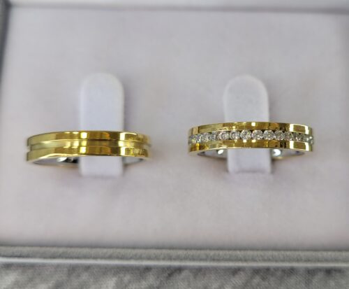 Acabamento externo: Másc.: Reta, polida, com friso no centro. | Fem.: Reta, polida, trilho de pedras de zircônias cravadas no centro.