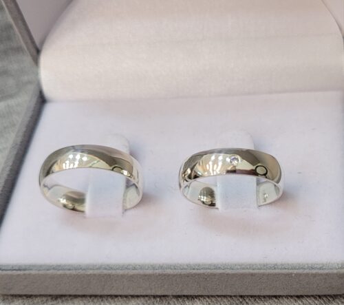 Acabamento externo: Másc.: Abaulada, polida, lisa, modelo tradicional. | Fem.: Abaulada, polida, lisa, modelo tradicional, com pedra de zircônia cravada no centro.