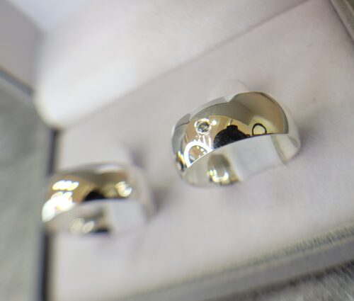 Acabamento externo: Másc.: Abaulada, polida, lisa, modelo tradicional. | Fem.: Abaulada, polida, lisa, modelo tradicional, com pedra de zircônia cravada no centro.