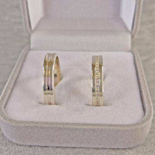 Acabamento externo: Másc.: Reta, polida, com friso no centro. |  Fem.: Reta, polida, trilho de pedras de zircônias cravadas no centro.