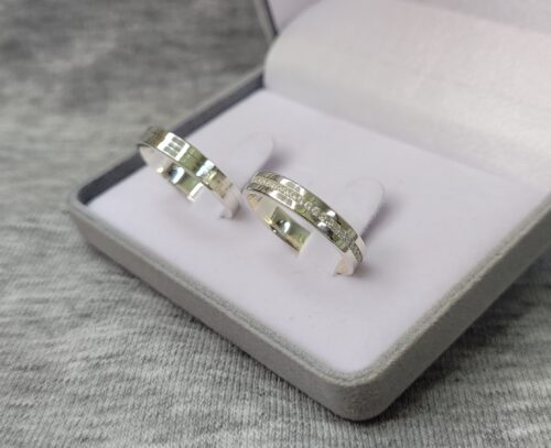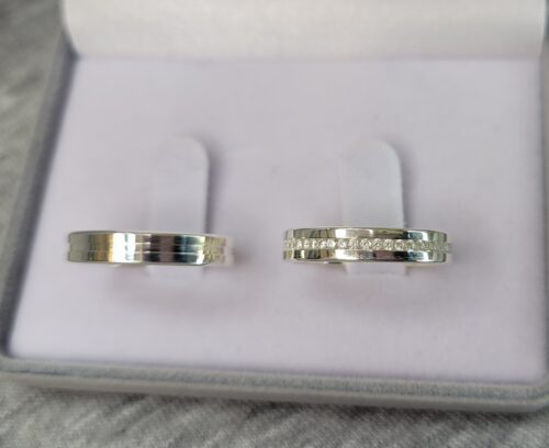 Descrição: Aliança de compromisso ou namoro, exclusiva,  produzida em prata. A aliança masculina tem acabamento reto, polido, com friso no centro. Na feminina ao invés do friso, temos pedras de zircônia cravadas no trilho.