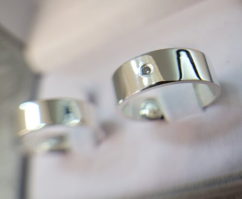 Acabamento externo: Másc.: Reta, polida, lisa, modelo tradicional. | Fem.: Reta, polida, lisa, modelo tradicional, com pedra de zircônia cravada no centro.