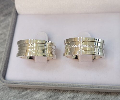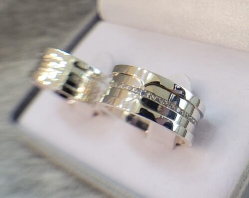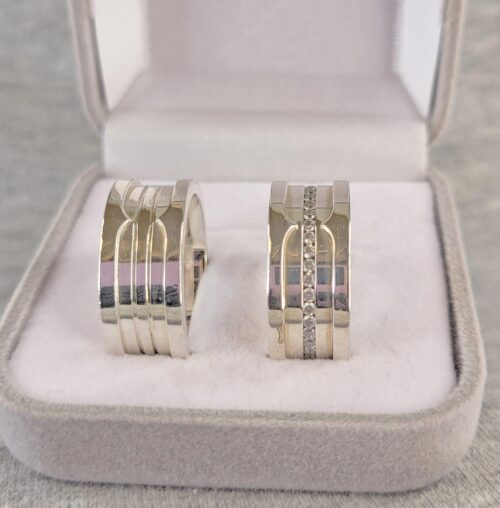 Descrição: Aliança de compromisso ou namoro, exclusiva, produzida em prata. A aliança masculina tem acabamento reto, bordas em relevo com detalhe em bico, friso diamantado no centro. Na feminina substitui-se o friso diamantado por um trilho com pedras de zircônia cravadas.