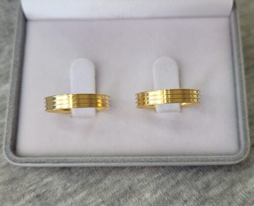 Descrição:Aliança de casamento ou noivado, folheada a ouro, modelo exclusivo. Aliança com acabamento externo reto, polido, com 3 frisos.