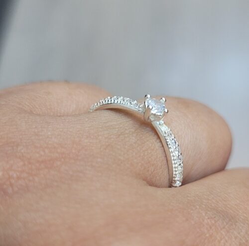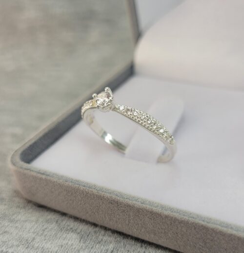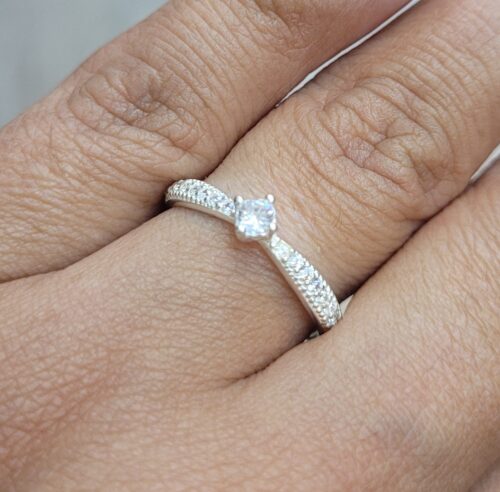Anel Solitário de Prata, cravejado com pedras de zircônia, caixa da pedra grande com detalhe de coração.