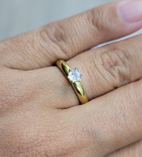Solitário de moeda antiga Largura: 3 mm Espessura: 1,5 mm Material: Liga de moeda antiga Acabamento Externo: Abaulado, polido com pedra de zircônia cravada. Acabamento Interno: Anatômica Descrição: Solitário em liga de moeda antiga, com pedra de zircônia e forro anatômico. IMPORTANTE: Este material demanda alguns cuidados, esta liga tende a oxidar com o tempo, a limpeza e manutenção periódica do material fazem com que mantenha sua beleza constante. Obs.: Pessoas alérgicas a bijuterias podem apresentar alergia a este tipo de material.