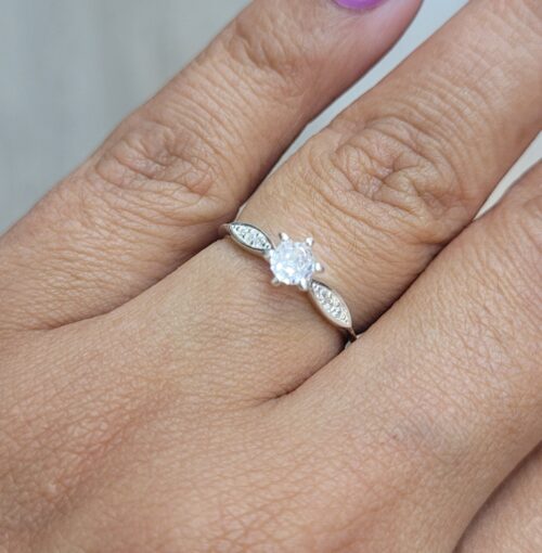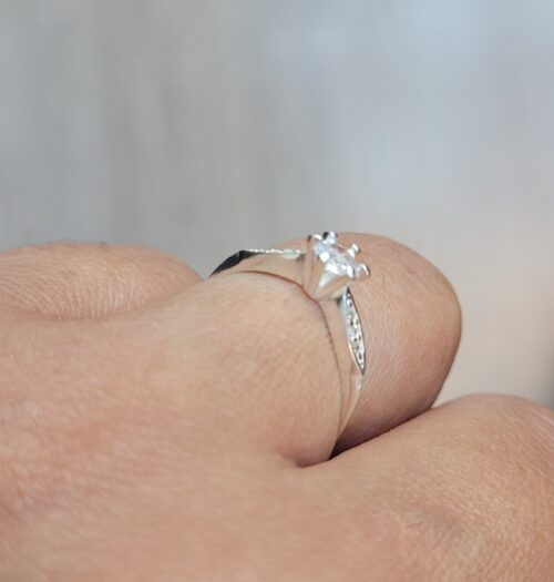 Anel Solitário de Prata com uma pedra de Zirconia grande no centro, e 3 micro zircônias cravadas em cada lateral, totalizando 7 pedras