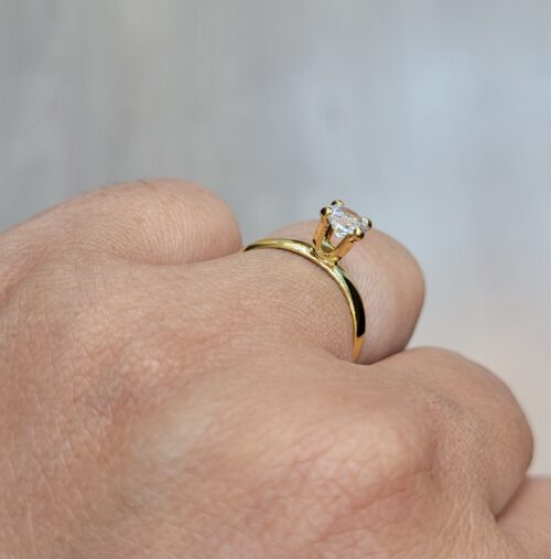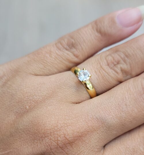 Descrição: Solitário folheado, com 3 mm de largura, e pedra de zircônia com 5,5 mm no topo.